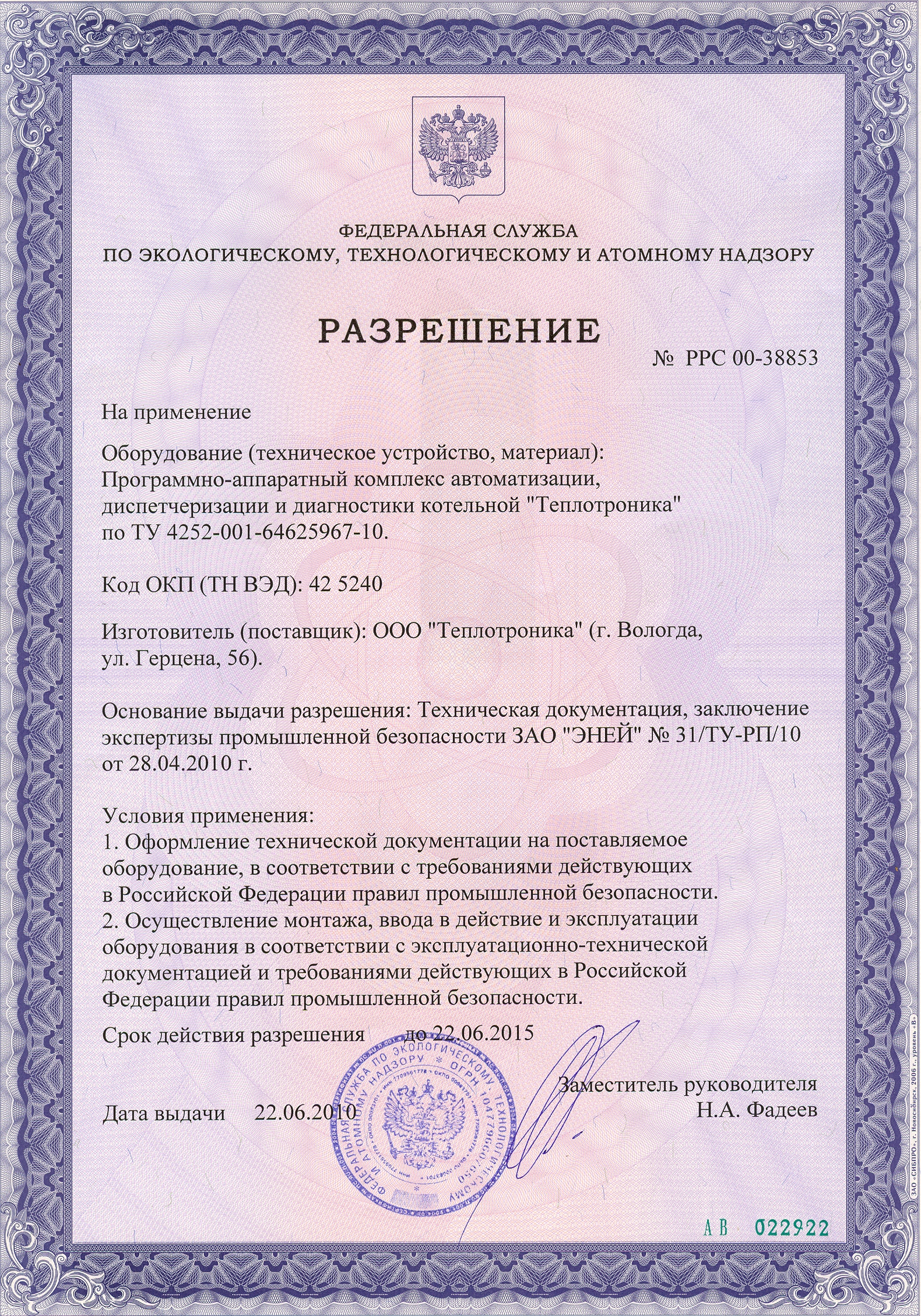 Разрешение на применение программно-аппаратного комплекса «Теплотроника», выпускаемого по ТУ 4252-001-64625967-10, выдано Федеральной службой по экологическому, технологическому и атомному надзору РФ 22 июня 2010 года. Документ подтверждает соответствие комплекса действующим требованиям промышленной безопасности к техническим решениям, применяемым на опасных производственных объектах.